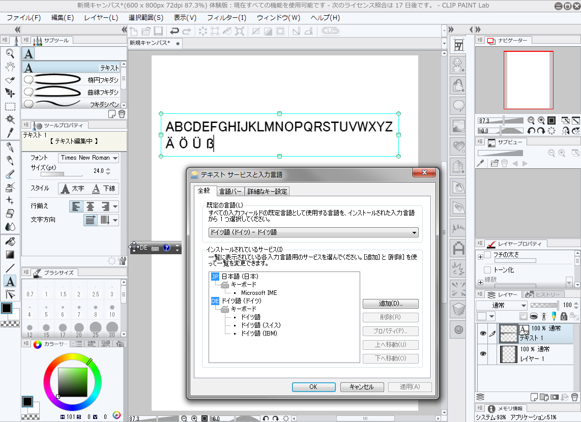 Windows7 OS上のコントロールパネルからの入力言語の追加手続きを経て、其々の外国語を入力できるようにしておりますが、つまり検索などでもIMEの設定が済んでいるからこそ、外国語で検索などできる、という状態です。しかしながら、なぜかCLIP PAINT Lab上では中国語簡体字については上記フォントを利用することで完璧に表現できますが、ハングル文字表記においては文字自体の表記は一部できますが操作性において機能不全を引き起こし、入力枠内のみのフリーズのように、連続した単語として成立しない状態が続きます。ロシア語キリル文字においてはキリル文字を所有のフォントであるにも関わらず全角表示のみの表記しかできません(文章としてはロシア語文章が表現できはしますがそれは全角文字の形のみ)。ドイツ語はアルファベットすらでない始末でした。おそらくまだシステムとしてCLIP PAINT Labでは言語対応は完了していないのではないかと感じますが、描画全般の機能においては素晴らしく使いやすくなっているだけに、それがかなり残念でありました。(^^)
