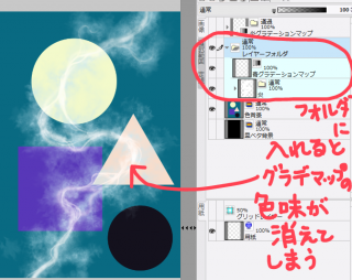 フォルダに入れていないので、上にあるグラデマップレイヤーの効果が