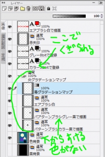また、グラデ彩色を用いる以外にも特定のレイヤに描画されたものの色だけを変更する方法として