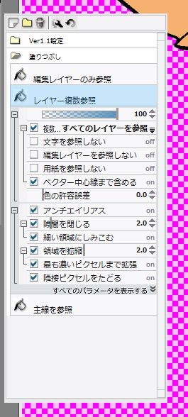 いつも利用させていただいております。 質問なのですが、塗りつぶしツールでイラストスタジオ内で描いた線の内部を塗りつぶししようとすると その線との間に隙間が出来てしまいます。 例えば髪に影を塗ろうとする際、まずはその影の枠だけを線で描き、その後中を塗りつぶす、といった手順です。 オプションの領域の拡縮で試してみても、何故かイラスタで描いた線の方には領域拡大が適用されず。 (スキャンで取り込んだ線画には拡大が適用される) 何か他の設定で解決法があるのでしょうか? 一応設定画像と実際の隙間の画像を添付いたします。 よろしくお願いいたします。 ![]() ![]() --------------------------------------------------------- ■IllustStudio IllustStudio( 1.2.7 ) IllustStudioMini( ) バージョン: ※[ヘルプ]メニュー→[バージョン情報]で確認できます。 ■OS Windows XP( ) Windows Vista( ) Windows 7( ○ ) その他( ) --------------------------------------------------------- |