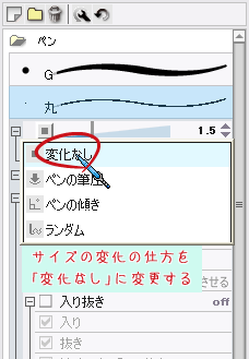 3.あとはペンツールから丸ペンなど任意のブラシを選択、サイズの変化の仕方を「変化なし」に変更して