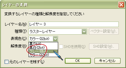 レイヤーを選択し、[レイヤー]メニュー→[レイヤーの変換]をクリック後、