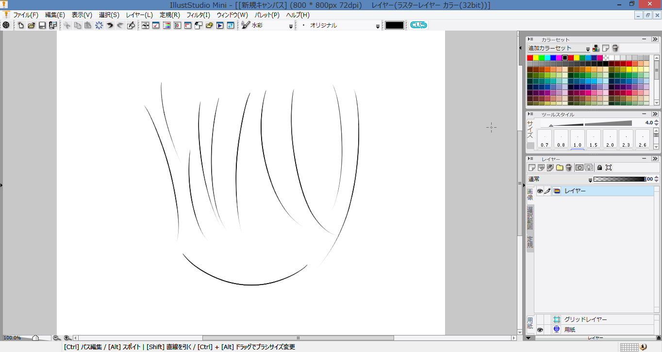 ・作成中のキャンバスサイズと解像度:800×600 72dpi(350にしたときもありましたが、同じくギザギザしていました)