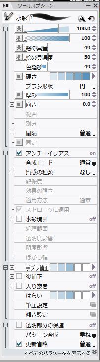 クリスタでは水彩ツールでなるべくこれに近くなるように数値を弄ったものを使用しています。