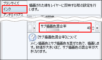 [サブツール詳細]パレットの[インク]タブを選択し、[サブ描画色混合率]を