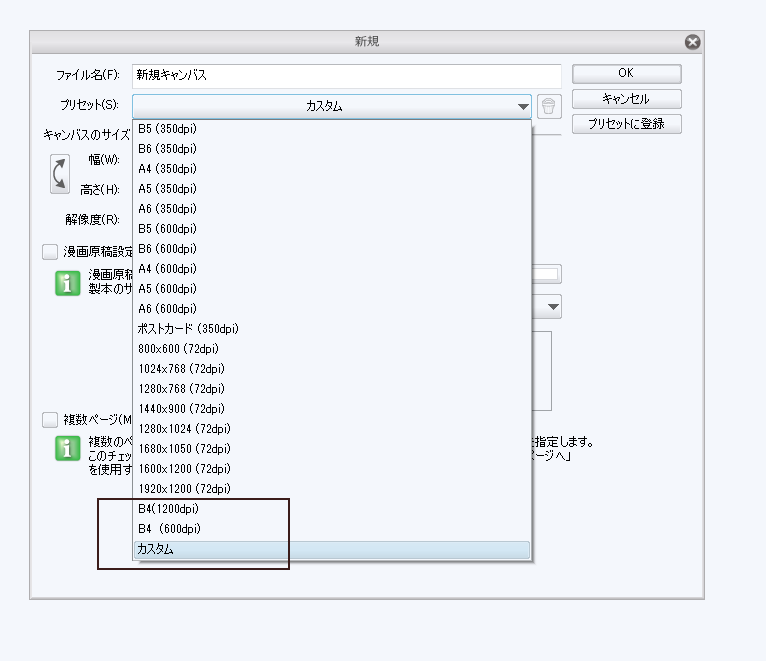 プリセットにB4(600dpi)とB4(1200dpi)の用紙を登録すると