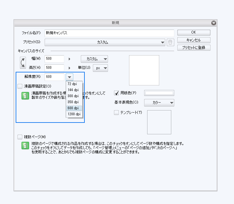 CLIPSTUDIOPAINT EXを起動しメニューの「新規」をクリックし新規キャンバス作成ウインドウを表示させます。