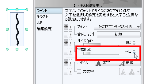 2.サブツール詳細パレットにて、「字間」の値を調整します。