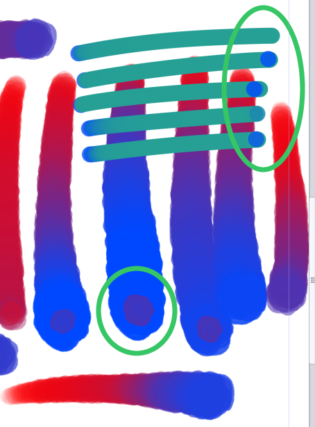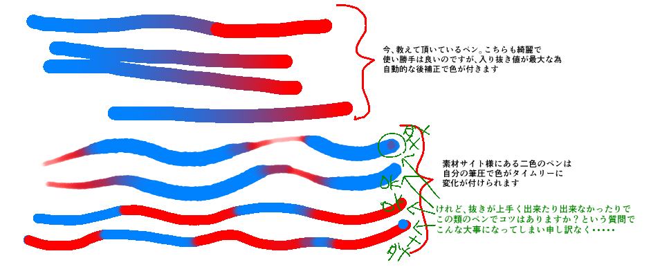 素材サイト等でメインカラーとサブカラーの二色を使用したブラシをダウンロードしたり、自分で作成したりするのですが、いつも上手くブラシコントロールが出来ず以下の画像の様になっております。 しかしたまには上手く描けるので、私のブラシコントロールが悪いのかと思うのですが・・・ ペン先はすべりの良いものに変えてみましたが変わらずです メインカラーが赤、サブカラーが青として 赤→青→赤 の色変化ではなく、 赤→青 が良いのですが難しいですか? 皆様、何かコツの様なものはありますでしょうか?急ぎませんのでご教授お願いします。 ![]() ------------------------------------------------------------ ■バージョン: 1.2.0、1.2.2 ■グレード PRO( ) EX( 〇 ) ■OS Windows XP( ) Windows Vista( ) Windows 7 ( 〇 ) Windows 8( ) MacOS X 10.5( ) MacOS X 10.6( ) MacOS X 10.7( ) MacOS X 10.8( ) その他( ) ------------------------------------------------------------ |