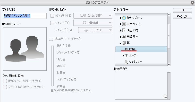 ・CLIP STUDIO PAINTの[素材]パレットに保存した体型は表示されていますで