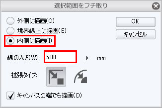 3.ダイアログで[内側に描画]を選択し、線の太さを5mmにします。