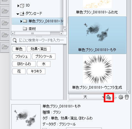 登録したい素材を選択し、赤枠のボタンをクリックすると素材の種類により