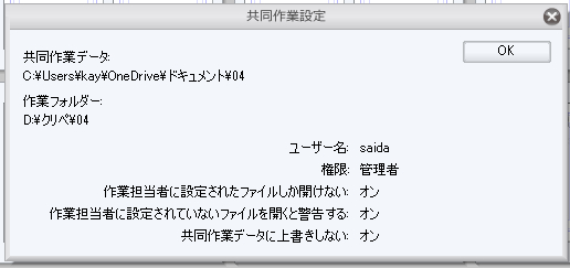 申し訳ありません、教えて下さい。使い方を勉強しようとしていただけなのでデータは戻らなくて大丈夫です。 元々のファイルはDドライブにあるファイルを、ファイル→共同作業→設定作業→共同作業設定を以下の通りにし、その後Cドライブの共同作業ファイルを削除しました。 ![]() その為か、もともとのDドライブのファイルの編集や開くなど全くできなくなりました。エラーの内容は ページ管理ファイルはあなたの担当ではありません 共同作業:共同作業データにアクセスできません 共同作業データにアクセスできません などです。 お伺いしたいのは、強制的に共同作業をやめて通常作業に戻る方法、また、強制的ではなく、共同作業が終了したら、最後に共同作業をやめる方法がやっても判らず、マニュアルも見つけられずで、大変お手数ではございますが、ご教授お願いできたらと思います。全く急ぎませんのでどうぞよろしくお願い申し上げます。 ------------------------------------------------------------ ■バージョン:1.3.2 ※[ヘルプ]メニュー → [バージョン情報]で確認できます。 ■グレード DEBUT( ) PRO( ) EX(○) ■OS Windows XP( ) Windows Vista( ) Windows 7 ( ○) ■共同作業指定先 マイクロソフト one drive ■共同作業しているPC EX win8.1 ------------------------------------------------------------ |