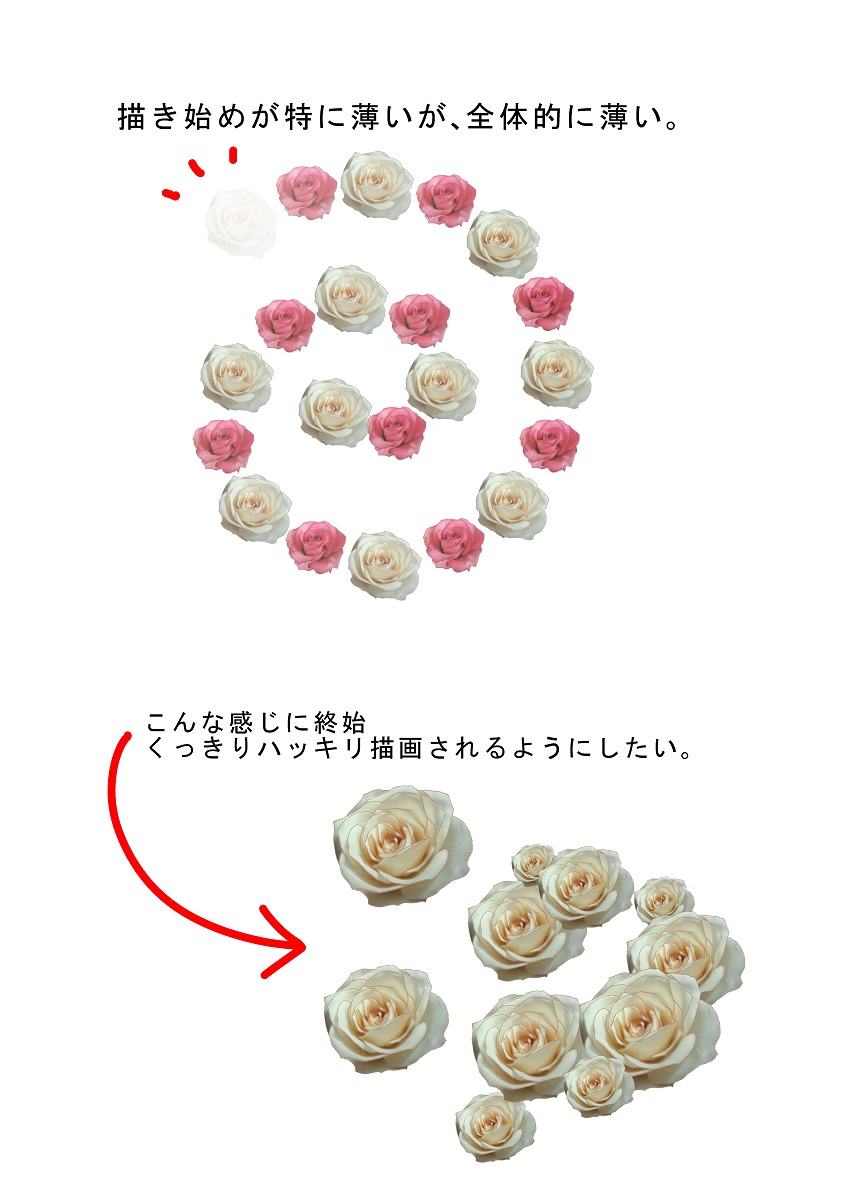 カスタムサブツールの作成でブラシ素材をつくってみたものの、描き始めが薄く全体的にやや薄い描画になってしまいます。(下の絵が透ける) いろいろ試しているうちに1つだけ成功しましたが、薄くしか描画できないブラシ素材とどこがどう違って綺麗に描画できるのか、できないのかわかりません。 インクの不透明度は100、ブラシ濃度も100にしていますが、他のどの設定を変えても薄くしか描画できません。 自作の素材でもダウンロードした素材をブラシ先端の素材と使用してもやはり描き始めが薄く全体的に薄い描画のブラシにしか作成できません。 終始くっきりハッキリ描画できるブラシにするためにはどうすればいいのか教えてください。 CLIP STUDIO PAINT EX 1.3.3を使用しています。 ![]() ------------------------------------------------------------ ■バージョン: ※[ヘルプ]メニュー → [バージョン情報]で確認できます。 ■グレード DEBUT( ) PRO( ) EX(○ ) ■OS Windows XP( ) Windows Vista( ) Windows 7 (○ ) Windows 8( ) Windows 8.1( ) MacOS X 10.5( ) MacOS X 10.6( ) MacOS X 10.7( ) MacOS X 10.8( ) MacOS X 10.9( ) その他( ) ------------------------------------------------------------ |