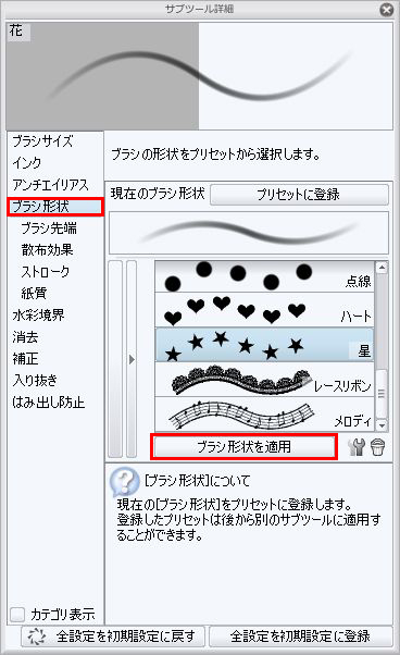なお、カスタムブラシを作る際には、サブツール詳細の[ブラシ形状]で