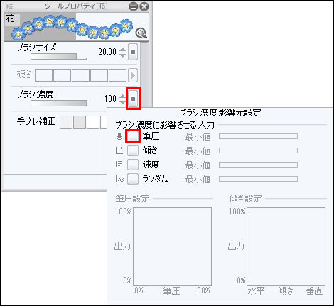 ツールプロパティのブラシ濃度の右側の長方形アイコンをクリックし、