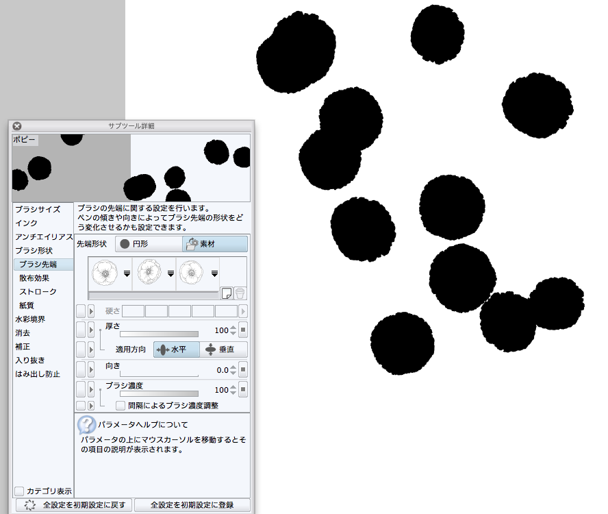 サブツールのデコレーション素材に最初から入っている【花】の【ポピー】というブラシが、 添付の画像のように黒一色になります。 他の花ブラシ、モノクロ素材ブラシも同様です。 カラー素材はきちんと表示され、描くことができます。 ![]() お手数ですが何卒ご回答よろしくお願いします。 ------------------------------------------------------------ ■バージョン: ※[ヘルプ]メニュー → [バージョン情報]で確認できます。 ■グレード DEBUT( ) PRO( ) EX( ○ ) ■OS Windows XP( ) Windows Vista( ) Windows 7 ( ) Windows 8( ) Windows 8.1( ) MacOS X 10.5( ) MacOS X 10.6( ) MacOS X 10.7( ) MacOS X 10.8( ◯ ) MacOS X 10.9( ) その他( ) ------------------------------------------------------------ |