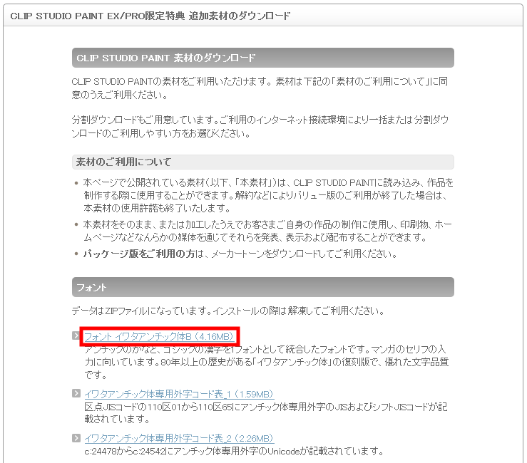 そちらからCLIP STUDIO PAINT EXの[ダウンロード]をクリックし素材のダウンロード画面へ行きましたが、どちらのファイルにイワタアンチック体Bがありますでしょうか?