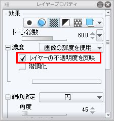 なお、レイヤープロパティで[レイヤーの不透明度を反映]のチェックを