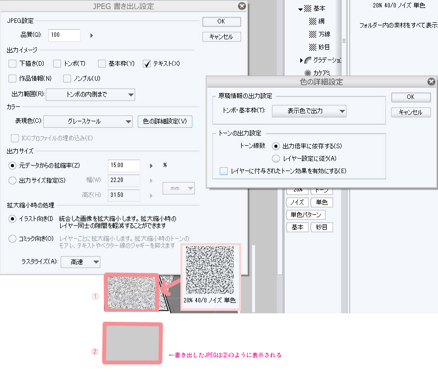 WEB用に公開したく画像を作成しています。 A5サイズ(148×210)で作成してる原稿サイズを15%に縮小(500px×700px前後にしたい為)するので グレースケールでJPEG形式で保存しています できればノイズのまま(下記画像の①)表示したいのですが、 グレースケール化するとノイズもグレー化していまうのでしょうか?? (確かにトーン化を解除すると画面上グレー化しますが・・・) 以前comicstudio3.0を使用していたとき、 同様にグレースケール化で保存のしていましたがノイズはノイズのまま表記されていましたのfr なにか方法があれば教えていただけるとありがたいです。 ![]() ------------------------------------------------------------ ■バージョン: ※[ヘルプ]メニュー → [バージョン情報]で確認できます。 ■グレード DEBUT( ) PRO( ) EX( ● ) ■OS Windows XP( ) Windows Vista( ) Windows 7 ( ) Windows 8( ) Windows 8.1( ● ) MacOS X 10.5( ) MacOS X 10.6( ) MacOS X 10.7( ) MacOS X 10.8( ) MacOS X 10.9( ) その他( ) ------------------------------------------------------------ |