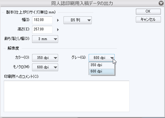 ・[同人誌印刷用入稿データの出力]の画面で[グレー]の[350dpi]と