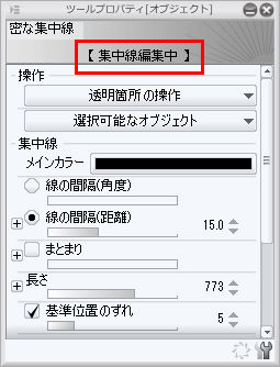 ツールプロパティに[集中線編集中]と表示されたら、各項目を
