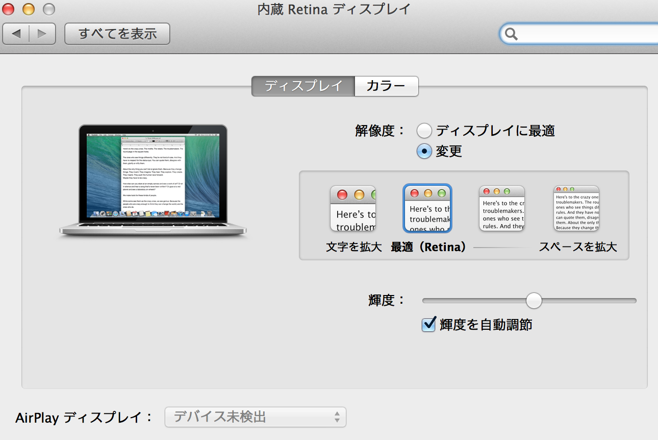 一番左は全くアンチエイリアスがついていませんが、右の3つは同じくらいアンチエイリアスがついているようです。MacBookAirの時ほど滑らかではなく、表示倍率を縮小するとギザギザとした印象になります。