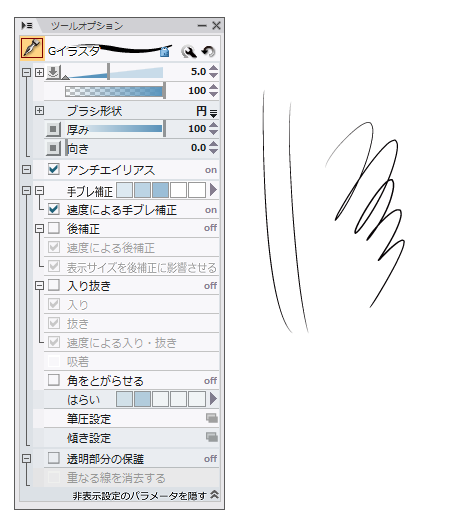★以前Illuststudioを使っており、同じペン設定を書き出ししてCLIPSTUDIOでも試してみました。 双方に差が出るのは十分承知の上なのですが、Illuststudioのようにジャギーが入ったような線にすることはできないのでしょうか。 CLIPSTUDIOの線画はずいぶんもったりしているように思えます。 ★上画像(CLIPSTUDIO)の線は力を入れて引いたときの線です。書き始めと終わりが微妙に細くなってしまうのを直せないでしょうか。入り抜きはなしに設定してあるのですがどこを調節すればいいのかわかりません。 ★また、CLIPSTUDIOの『筆圧検知レベルの調節』でためし書きをしている時の書き味が一番理想に近いので それの設定がわかる場合は教えてほしいです。 沢山質問してしまいましたが回答の方よろしくお願いします。 ![]() ![]() ------------------------------------------------------------ ■バージョン: ※[ヘルプ]メニュー → [バージョン情報]で確認できます。 ■グレード DEBUT( ) PRO( ) EX( 〇 ) ■OS Windows XP( ) Windows Vista( ) Windows 7 ( 〇 ) Windows 8( ) Windows 8.1( ) MacOS X 10.5( ) MacOS X 10.6( ) MacOS X 10.7( ) MacOS X 10.8( ) MacOS X 10.9( ) MacOS X 10.10( ) その他( ) ------------------------------------------------------------ |