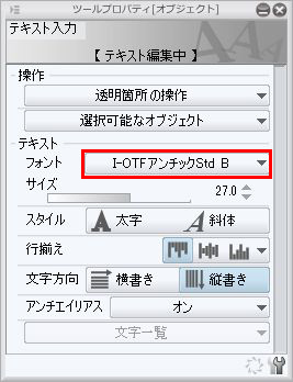 選択した状態でテキストオブジェクトをクリックし、ツールプロパティから