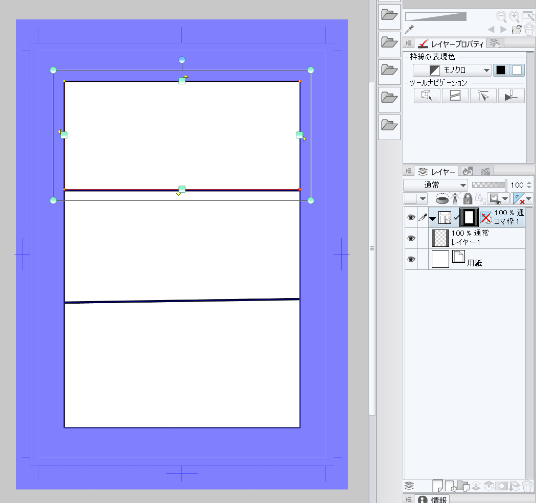 下記の画像の青で塗られているような、「枠線のないコマの作り方とその部分にマスクをつける方法」、 白で表示されてる「枠線があるコマのみにマスクをつける方法」がわかりません。 レイヤーやフォルダーを作るなら1コマごとにレイヤーを作るのではなく、『枠線なしコマ』と『枠線』という2つに 絞りたいと思っています。 ちなみに下記の画像は『コマ枠フォルダー』で枠線のないコマが作れないためく、ラスターレイヤーに描画しました。 ![]() ------------------------------------------------------------ ■バージョン: ※[ヘルプ]メニュー → [バージョン情報]で確認できます。 ■グレード DEBUT( ) PRO( ) EX( ○ ) ■OS Windows XP( ) Windows Vista( ) Windows 7 ( ) Windows 8( ) Windows 8.1(○ ) MacOS X 10.5( ) MacOS X 10.6( ) MacOS X 10.7( ) MacOS X 10.8( ) MacOS X 10.9( ) MacOS X 10.10( ) その他( ) ------------------------------------------------------------ |