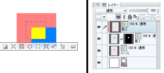 そして新規レイヤーを作成して影1レイヤーにクリッピングします。