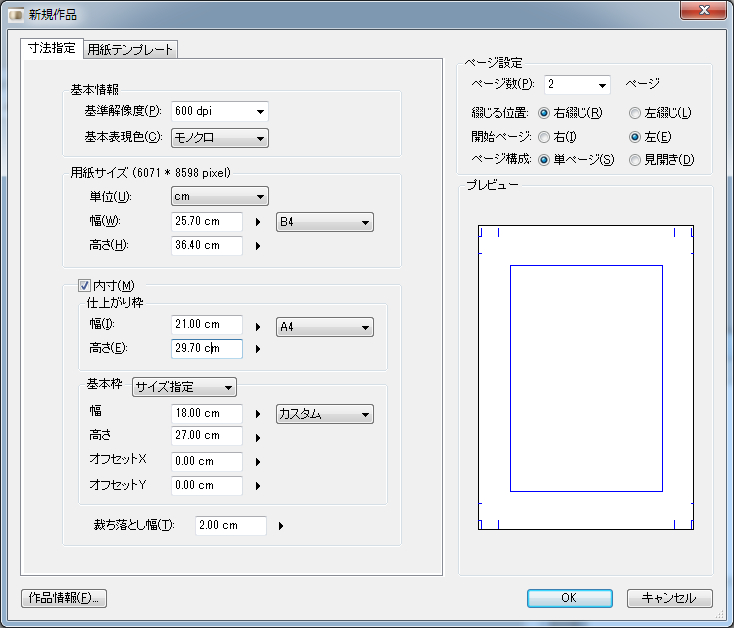 下図のように裁ち落とし幅がやはり「2.00cm」となっていたので、CLIP STUDIOでもそれにならって新規作成しても先程のようなレイアウトの原稿用紙になってしまいました。