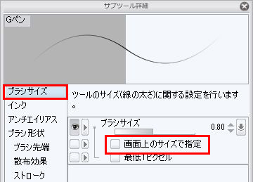 [ウィンドウ]メニュー→[サブツール詳細]を開き、[ブラシサイズ]から