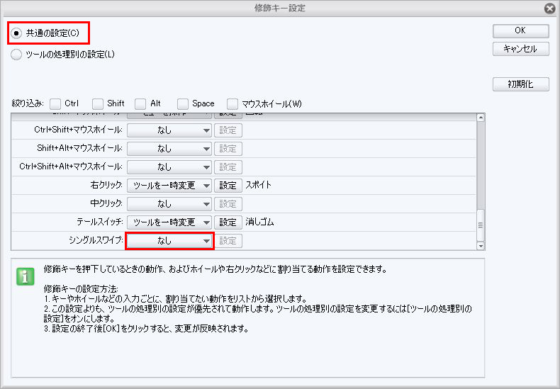3.シングルスワイプを[なし]にし、[OK]をクリックします。