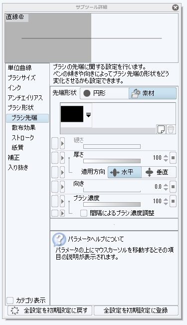 以下の画像は私が直線ツールに四角のブラシ先端素材を適用させたサブツール詳細です。