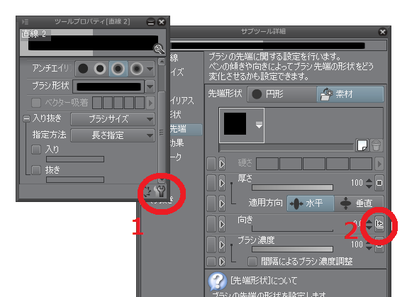 ![]() 先端が四角(■)になっているブラシを作りたいのですが、どうすればいいでしょうか。 自分で四角を描画し素材として登録→ブラシ先端形状に設定、というやり方を見かけたので試してみましたが、 水平、垂直への描画は問題ないのですが、斜め方向へ描画した際に描き始めと描き終わりが自分の求めていた形になりません。 コミスタであった「直線を描画」のような線を引きたいのですが、 そうしたブラシを作るにはどうすればいいでしょうか。 ------------------------------------------------------------ ■バージョン: ※[ヘルプ]メニュー → [バージョン情報]で確認できます。 ■グレード DEBUT( ) PRO( ) EX( ○ ) ■OS Windows XP( ) Windows Vista( ○ ) Windows 7 ( ) Windows 8( ) Windows 8.1( ) MacOS X 10.5( ) MacOS X 10.6( ) MacOS X 10.7( ) MacOS X 10.8( ) MacOS X 10.9( ) MacOS X 10.10( ) その他( ) ------------------------------------------------------------ |