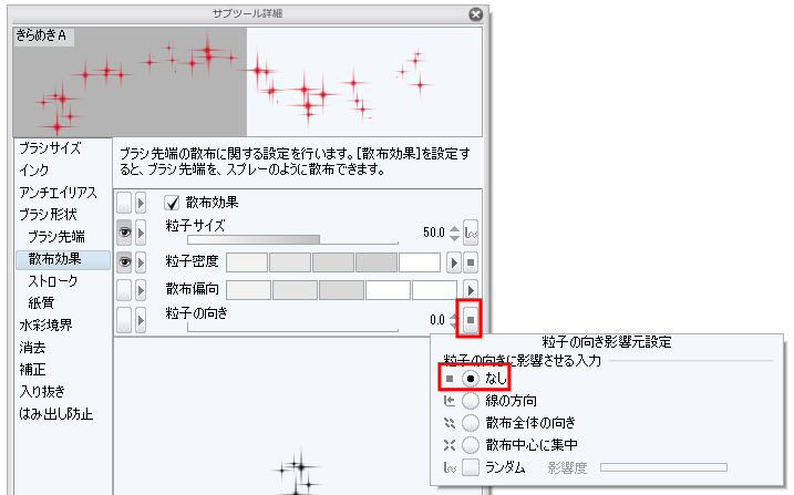 サブツール詳細の[散布効果]カテゴリで、粒子の向きの影響元設定を[なし]に