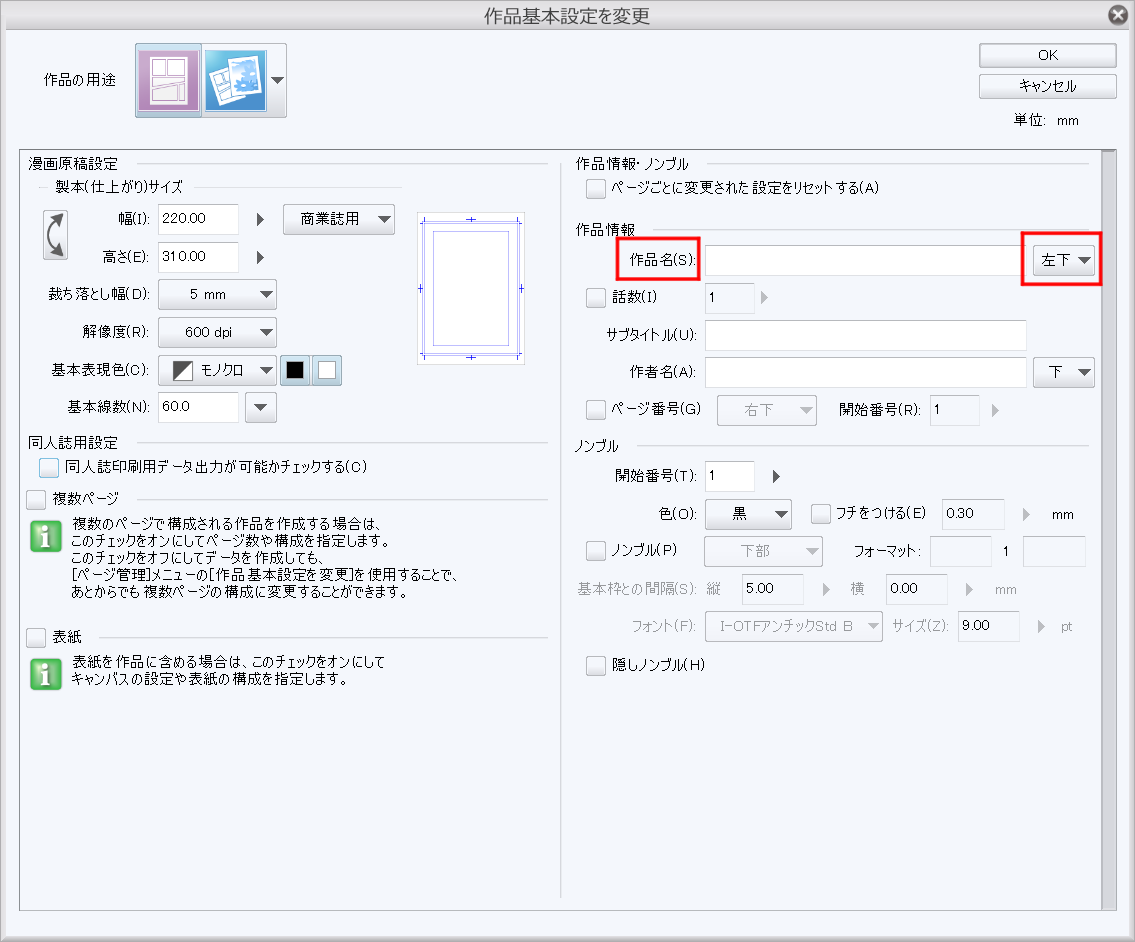 下記の赤枠内にタイトル等をご入力いただき、ご希望の動作