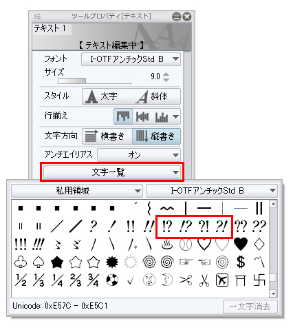 「!?」の文字入力については、文字入力時にツールプロパティの