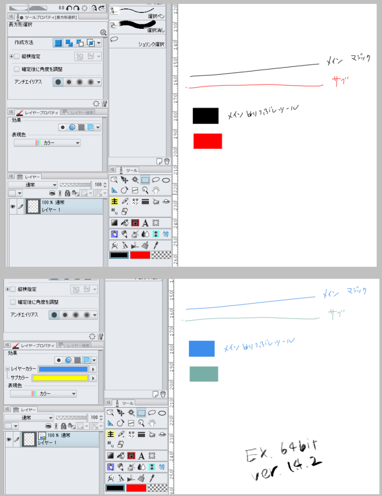 サブカラーでかいたものにメインカラーの色が意図せず混色しているようです![]() 画像は レイヤーの合成モード:通常、レイヤー透明度100% カラーラスターレイヤーで メインカラー黒 サブカラー 赤 で 不透明度100% 初期設定のままのマジックペンで書いたものと、 選択範囲を塗りつぶししたものです 通常の表示では 選んだメインカラーとサブカラーで描画されていますが レイヤープロパティのレイヤーカラーとサブカラーをそれぞれ青と黄色にしてみると サブカラーで描写した方にメインカラーが混じって濁っています 塗りつぶし設定でなくても フォントをサブカラーで入力し、(ラスタライズしないそのままの状態で) レイヤープロパティ表示をレイヤーカラーに切り替えても やはりサブカラーで書かれているはずの部分が濁ってみえます 描画用のメインカラーとサブカラー、およびレイヤーカラーとサブカラーを別の色にしても同じ症状がでます どうすればサブカラーにメインカラーが混ざらずに描画出来るのでしょうか? ------------------------------------------------------------ ■バージョン: ※[ヘルプ]メニュー → [バージョン情報]で確認できます。 ■グレード DEBUT( ) PRO( ) EX( 1.4.2 ) ■OS Windows XP( ) Windows Vista( ) Windows 7 ( ○ ) Windows 8( ) Windows 8.1( ) Windows 10( ) MacOS X 10.5( ) MacOS X 10.6( ) MacOS X 10.7( ) MacOS X 10.8( ) MacOS X 10.9( ) MacOS X 10.10( ) その他( ) ------------------------------------------------------------ |