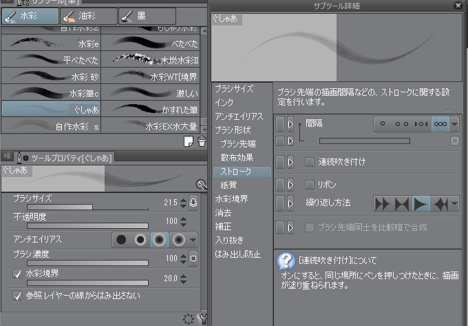 水彩などの筆ブラシは[下地混色]の設定がオンになっている等、Gペンなど