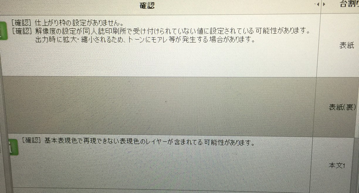 デジタルで同人誌を初めて作り、印刷用データ出力したのですが、仕上がり枠の設定がありません。基本表現色で再現できない表示色のレイヤーが含まれている可能性がありますと表示されたのですが、これらの解決方はわかりますでしょうか?一応3Dプレビューを見た感じ変な所はないようなのですが、無視して大丈夫なのでしょうか?それともキチンと問題を解決した方がよいのでしょうか?襲えて頂けると助かります。