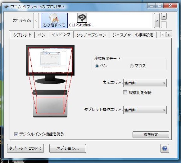 ・[ファイル]メニュー→[環境設定]を開き、[タブレット]を選択し、