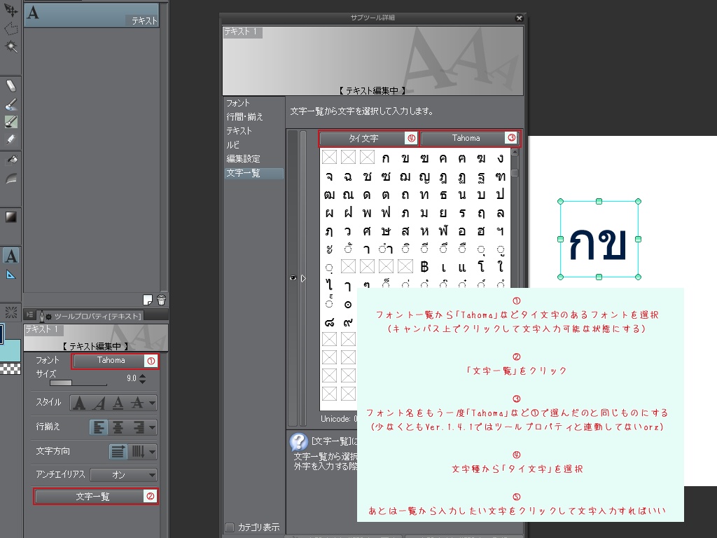 CLIPSTUDIOPAINTのテキストツールの文字一覧からタイ語を選択する