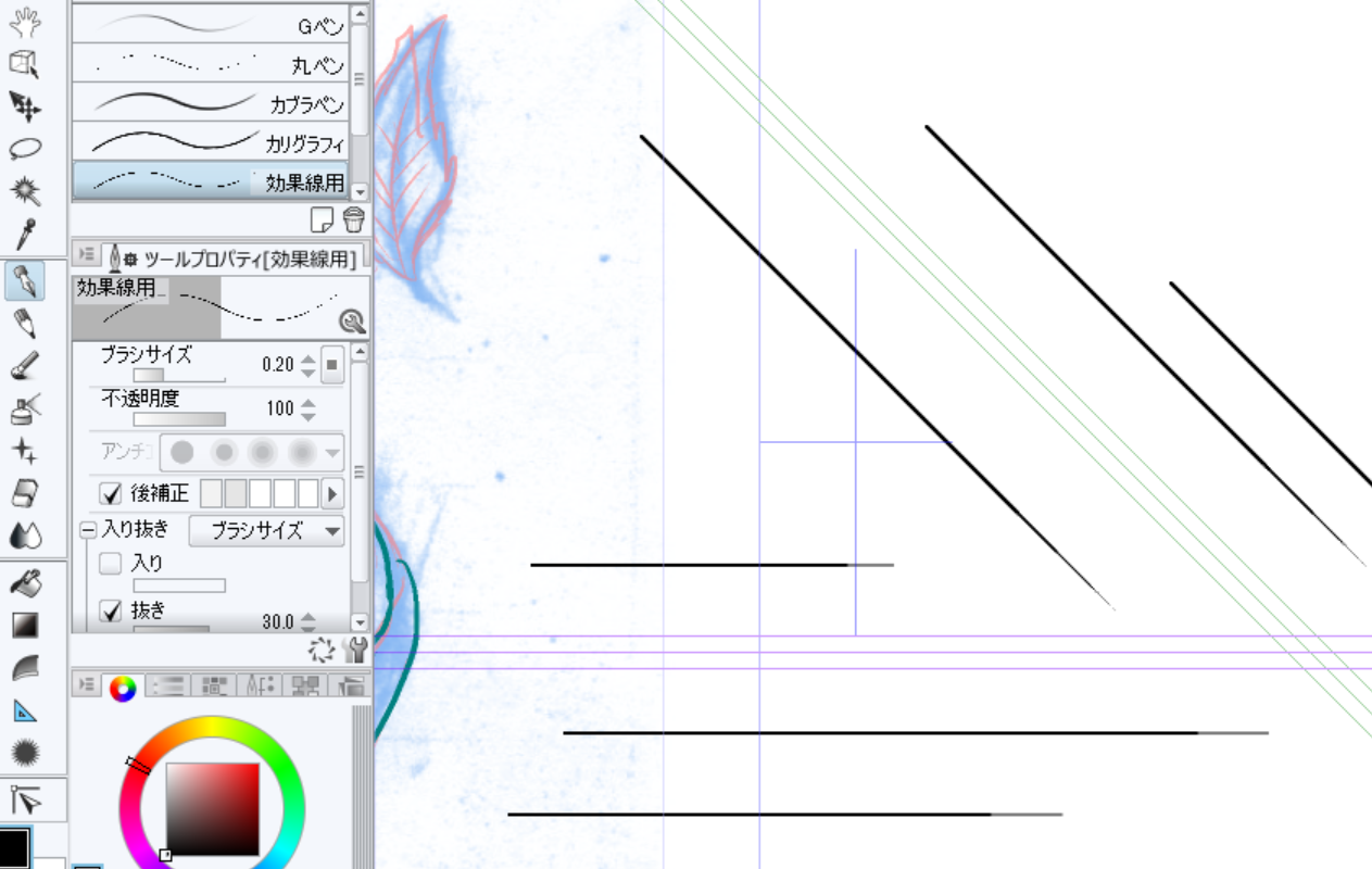 ペン: 効果線用 ブラシサイズ 0.2 入り 無し 抜き 有り(30.0) 速度による入り抜き 無し