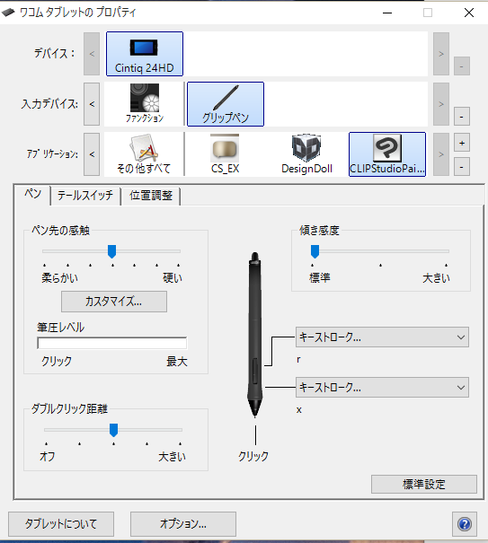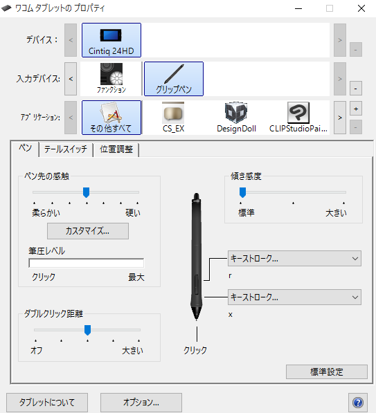 CLIP STUDIO PAINT (EX) 1.5.0と、液晶タブレット(Cintiq 24HD)を使用しています。 OSはWindows10です。 ペンのサイドスイッチに、以前は任意のキーストロークを割り当てられたのですが、 1.5.0にしたせいか、原因はわかりませんが、 現在ペンのサイドスイッチにキーストロークを設定しても、CLIP STUDIO PAINTで機能しません。 (コミスタや、他のソフトでは問題なく使えます) 具体的には下記のように割り当てたいです。 ![]() CLIP STUDIO PAINTのショートカットの設定で、xには描画色の変更、rには回転ツールを割り当て済みです。 似たような質問を見かけたので(http://www.clip-studio.com/clip_site/support/help/detail/svc/53/tid/33629) この通りにしましたが、うまく行きません。 「修飾キー設定」も見直しましたが、それらしい項目がありませんでした。 以前は問題なく使えたので、私が何か機能や設定の見落としをしているかも知れないのですが、思い出せません。 このキーストロークに限らず、どうも「ワコムタブレットのプロパティ」でのサイドスイッチの設定が全て CLIP STUDIO PAINTでは無効になってしまうようで、キーストローク以外でも割り当てても呼び出せません。 ペンのサイドスイッチが機能しないのは非常に不便なので、なにとぞ方法を伝授頂ければ幸いです。 (ドライバの入れ直しは試しておりますので、それ以外のお知恵をお借りしたいです) ------------------------------------------------------------ ■バージョン: ※[ヘルプ]メニュー→[バージョン情報]で確認できます。 ■グレード DEBUT( ) comico( ) PRO( ) EX( ● ) ■OS Windows XP( ) Windows Vista( ) Windows 7 ( ) Windows 8( ) Windows 8.1( ) Windows 10( ● ) MacOS X 10.5( ) MacOS X 10.6( ) MacOS X 10.7( ) MacOS X 10.8( ) MacOS X 10.9( ) MacOS X 10.10( ) MacOS X 10.11( ) その他( ) ■ペンタブレット Intuos Pro( ) Intuos Comic( ) Intuos( ) Intuos4( ) Intuos5( ) Cintiq( ) Bamboo Fun( ) Bamboo Comic( ) XP-Pen( ) Mousepad Tablet( ) その他( Cintiq 24HD ) ■ペンタブレット モデル名(型番):Cintiq 24HD ドライバのバージョン:6.3.15-1 (投稿時で最新) ------------------------------------------------------------ |