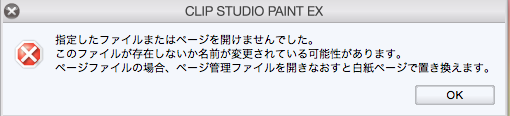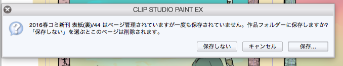 先ほど、クリップスタジオでデータを閉じようとしたところ、下記のようなメッセージが出ました。 そして「保存」ボタンを押しても、※印が消えず、データが保存されません。(何度か試しましたが同じでした) また、このページは過去に何度も上書き保存しており、「一度も保存されていない」というメッセージの意図がわかりません。 ![]() また、別のページを開こうとすると下記のようなメッセージが出ます。該当ページも過去に何度も保存しています。 ![]() 心当たりとして、直前に該当作品の.cmcファイルが入ったフォルダをfinder内で動かしています。 また、先週も同じ.cmcファイルで同様の状態になっています。 その際は「保存しない」を選択したため、完成原稿数枚が白紙の状態になりました。 どうぞアドバイスをよろしくお願いします。 ------------------------------------------------------------ ■バージョン:1.5.3 ※Windowsは、[ヘルプ]メニュー → [バージョン情報]で確認できます。 ※MacOSXは、[CLIP STUDIO PAINT]メニュー → [バージョン情報]で確認できます。 ■グレード DEBUT( ) comico( ) PRO( ) EX( ○ ) ■OS Windows XP( ) Windows Vista( ) Windows 7 ( ) Windows 8( ) Windows 8.1( ) Windows 10( ) MacOS X 10.5( ) MacOS X 10.6( ) MacOS X 10.7( ) MacOS X 10.8( ) MacOS X 10.9( ) MacOS X 10.10( ○ ) MacOS X 10.11( ) その他( ) ------------------------------------------------------------ |