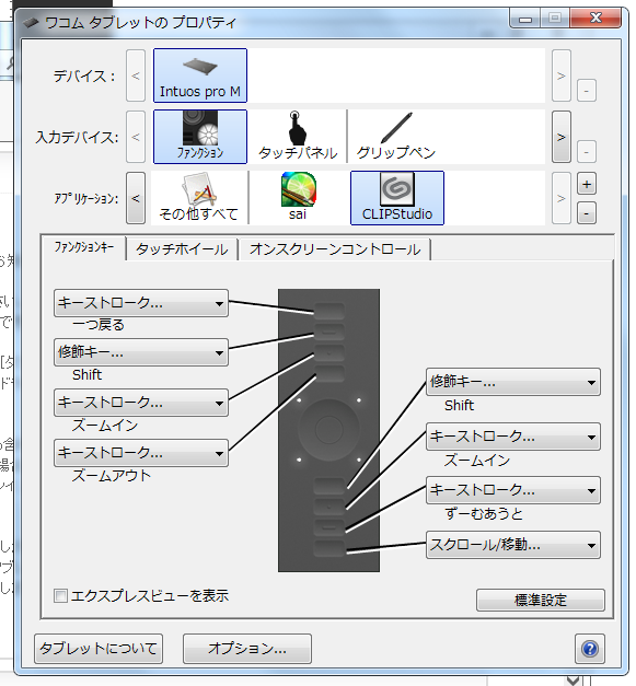 それから、ファンクションキーのキーストロークでsaiの方はきちんと動くのですが、クリップスタジオexの方では上の段二番目の装飾キーシフトが反応せずにエクスプレスビューが、三番目のズームインがプレジションモード(たぶんどちらも最初から割り当てられている機能)になっており、カスタマイズ通りに動きません。