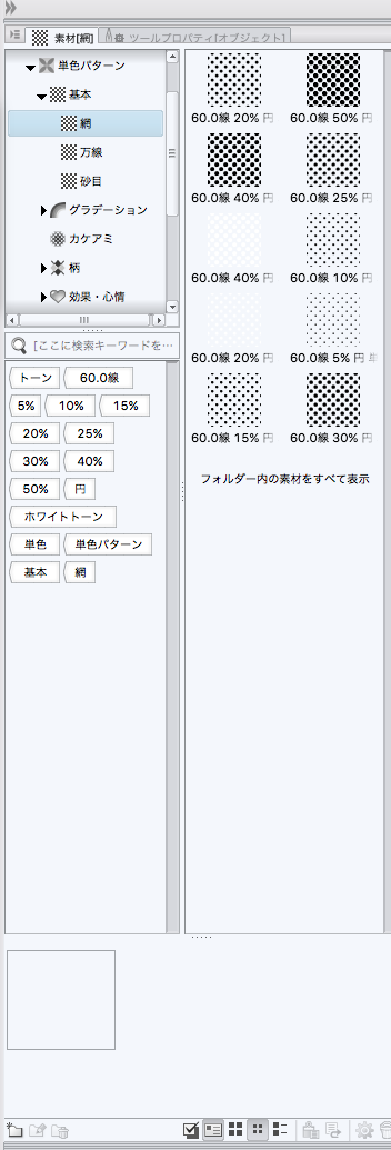 右のトーンの配置を並び替えたいのですが可能でしょうか? また自分で設定した濃度のトーンを追加したりもしたいのですが・・・ ![]() ------------------------------------------------------------ ■バージョン: ※Windowsは、[ヘルプ]メニュー → [バージョン情報]で確認できます。 ※MacOSXは、[CLIP STUDIO PAINT]メニュー → [バージョン情報]で確認できます。 ■グレード DEBUT( ) comico( ) PRO( ) EX( 0 ) ■OS Windows XP( ) Windows Vista( ) Windows 7 ( ) Windows 8( ) Windows 8.1( ) Windows 10( ) MacOS X 10.5( ) MacOS X 10.6( ) MacOS X 10.7( ) MacOS X 10.8( ) MacOS X 10.9( ) MacOS X 10.10( ) MacOS X 10.11( 0 ) その他( ) ------------------------------------------------------------ |