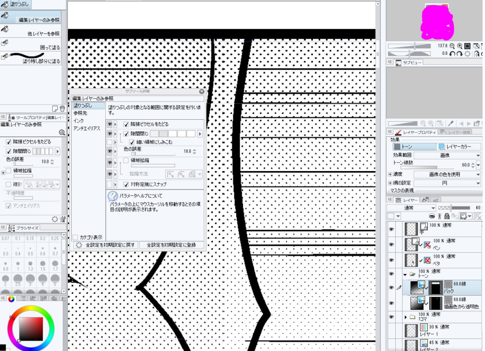 2.[塗りつぶしツール]の中のサブツールは[編集レイヤーのみ参照]をご選択されていますでしょうか。